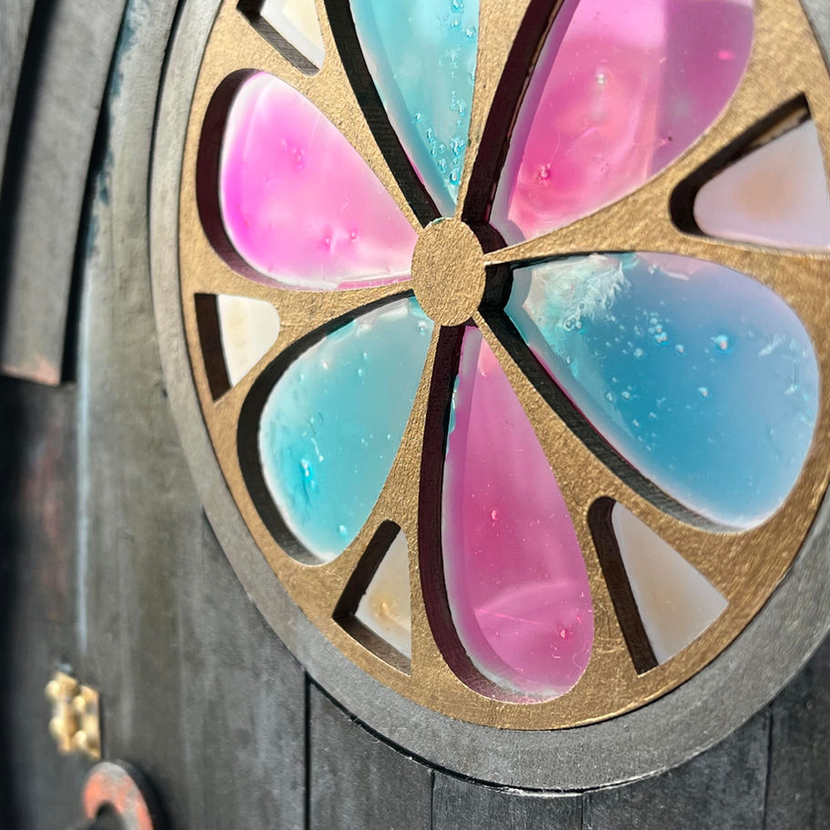 Gothic-style arch with a textured door and colorful faux stained glass rose window